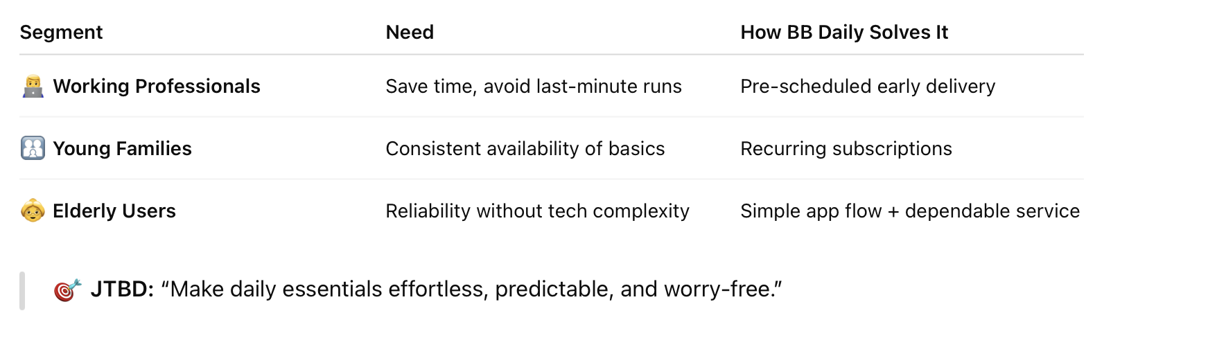 Core Job-to-be-Done: “BB Daily brings daily essentials to your doorstep — reliably, before your day begins.”